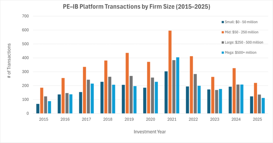The chart below, dating back to 2015, shows that mid-market private equity firms consistently lead PE–IB platform activity, maintaining deal momentum even during market slowdowns. Their adaptability and steady capital deployment make them resilient through volatile periods.